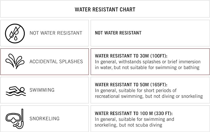 Water resistant to 30m (99ft): in general, withstands splashes or brief immersion in water, but not suitable for swimming or bathing
