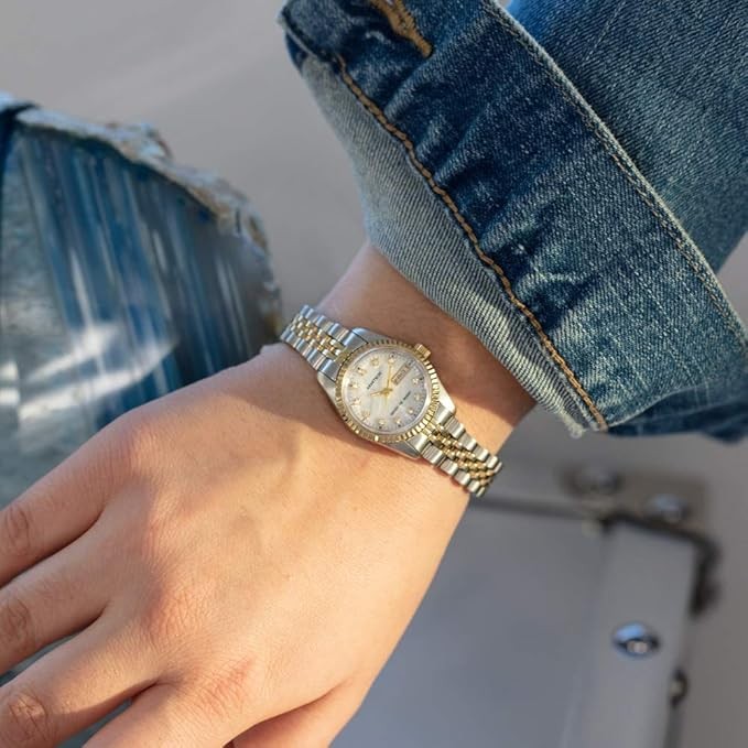 Mother-of-pearl dial with day/date calendar window; gold-tone hands and premium crystal markers; printed outer minute track