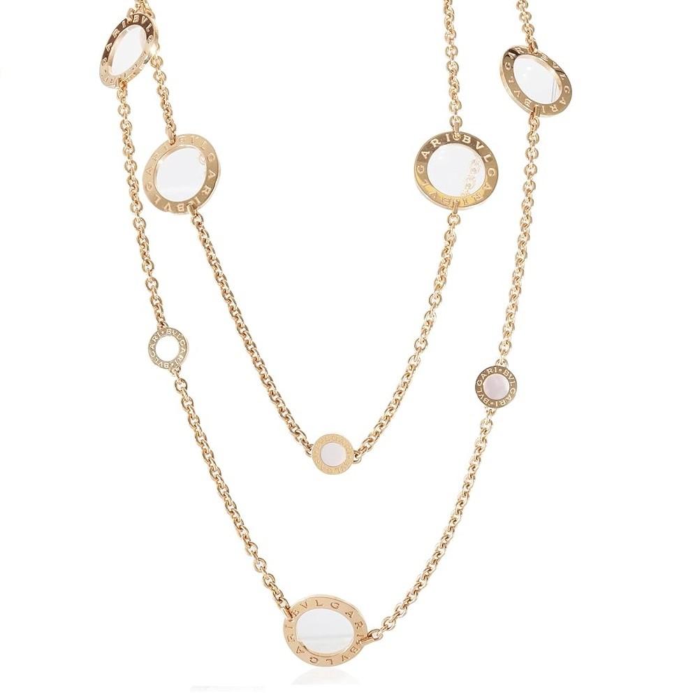 Bulgari looks to its heritage to create the Bulgari Bulgari collection. Engraved with logo lettering to echo ancient Roman typography, the designs are intended to work in harmony with each other. Retails for 14500 USD. In excellent condition. 38 in in length. Comes with Box.