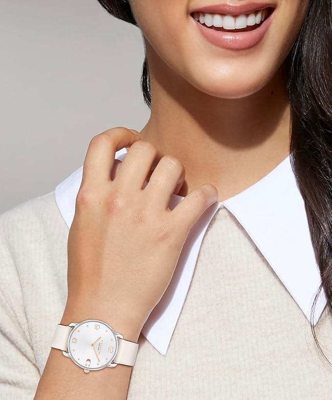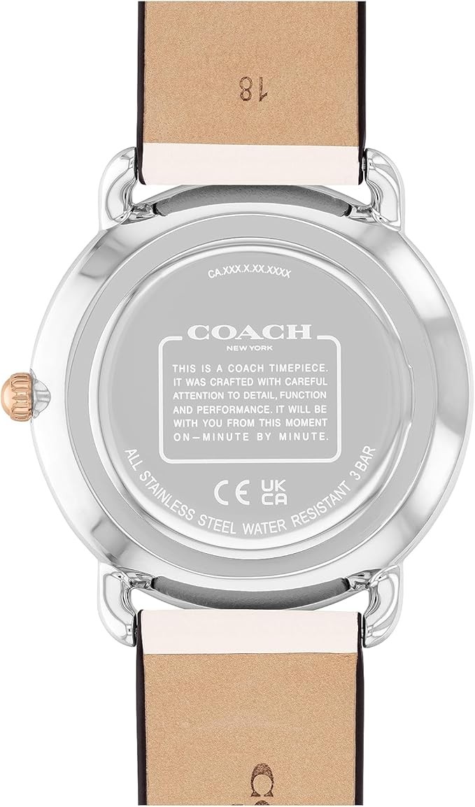 Quality Materials: Finished with a chalk leather strap, this stainless steel and rose gold tone round watch features a white sunray dial detailed with the Coach Signature marker at 3 o’clock.