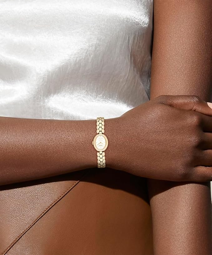 Designed with a modern minimalist sensibility, the Sammy is a refined timepiece perfect for everyday. This sleek gold tone bracelet watch features a silver white Coach Signature dial detailed with polished gold tone markers