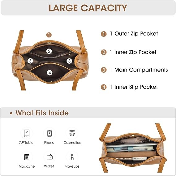 ORGANIZATION: This soft leather tote bag can fit up to 7.9” tablet. Totally 4 pockets. A roomy leather purses for your Pad, cosmetics, daily items, etc
