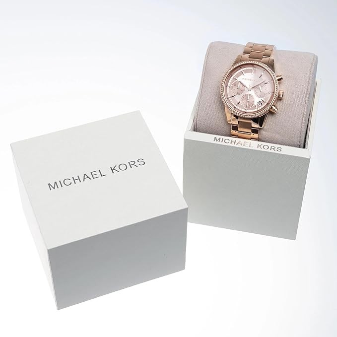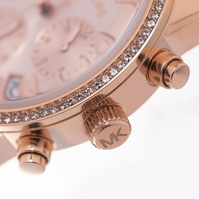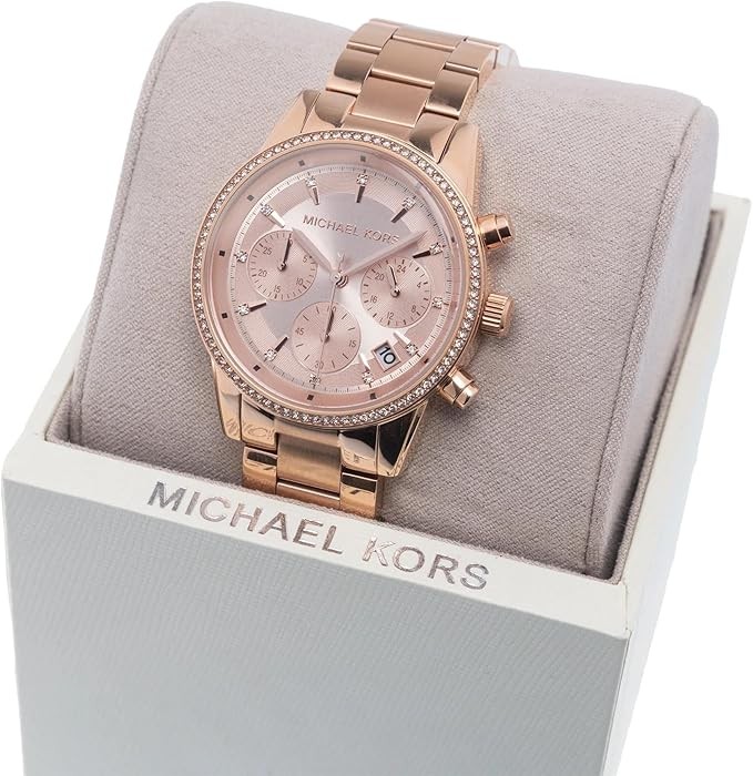 A pavé crystal topring and crystal-accented indexes add a feminine finishing touch to the menswear-inspired Michael Kors Ritz watch. A classic three-link bracelet with pavé crystal center links and textured dial complete this stylish-yet-functional watch.