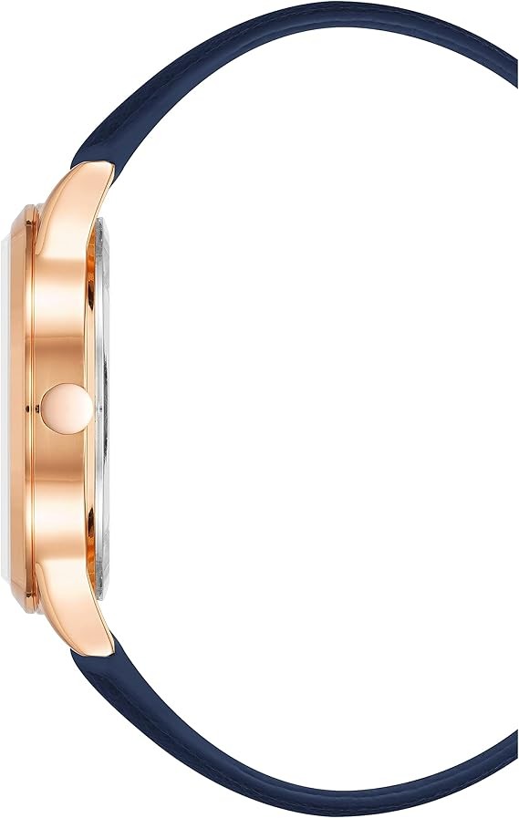 Navy blue sunray dial with white filled rose gold-tone hands and markers; white outer minute track