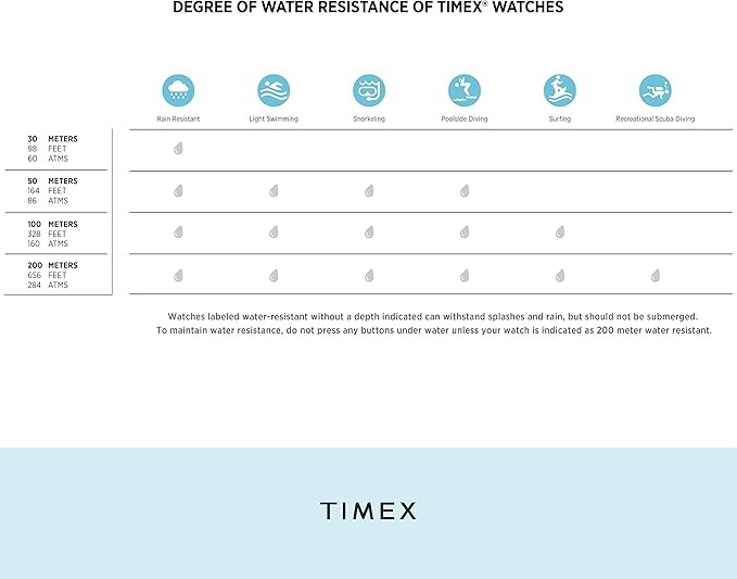 Water resistant to 30m (100ft): in general, withstands splashes or brief immersion in water, but not suitable for swimming or bathing