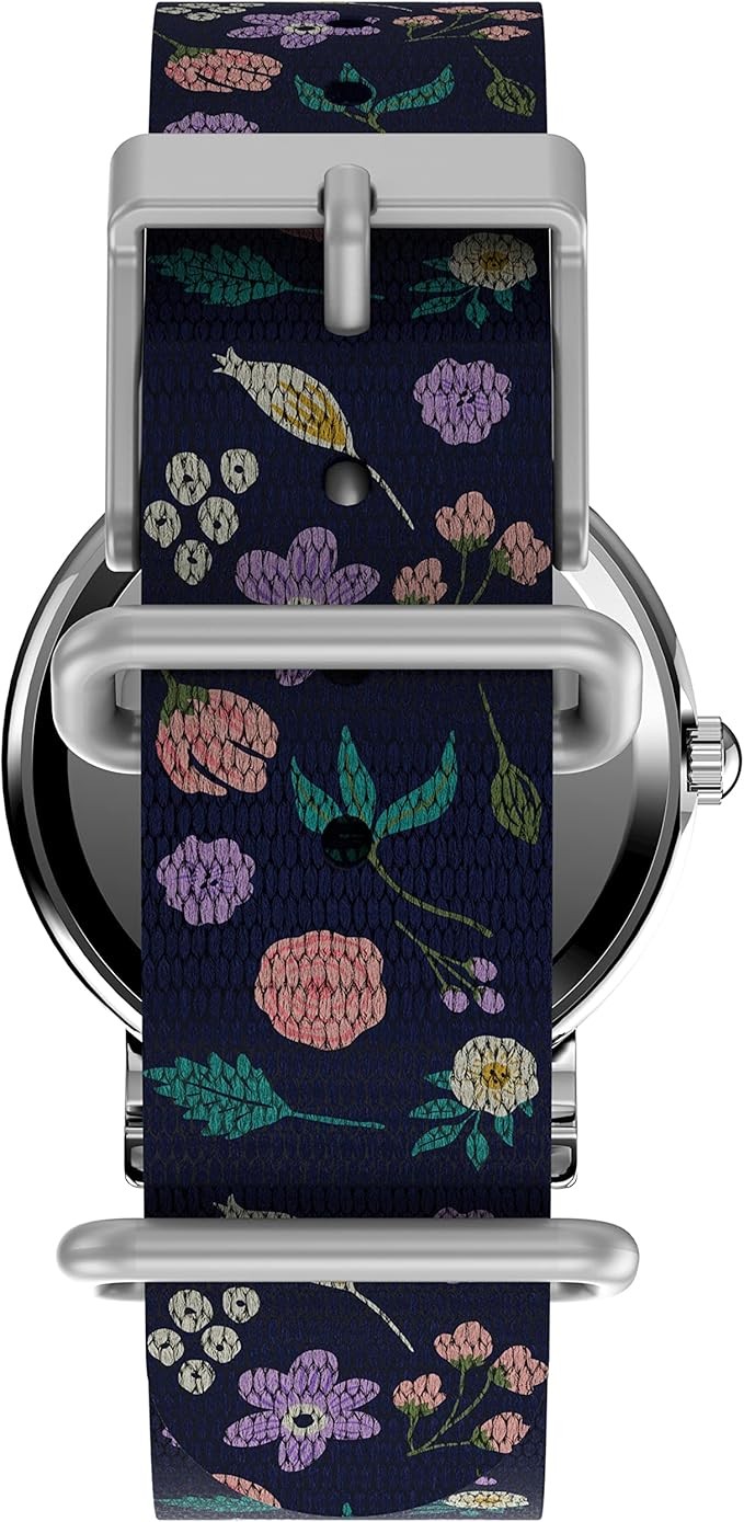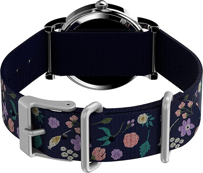 Timex Womens Watch Peanuts Weekender Casual Ladies Wristwatch - Featuring Snoopy and Woodstock in a Floral Motif, Silver-Tone Case with Blue Fabric Strap (31mm)